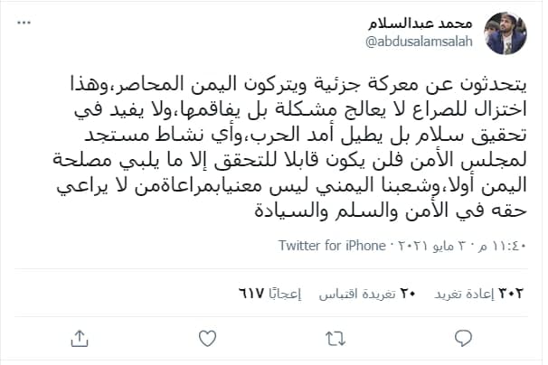 قال عبدالسلام في تغريدة على تويتر رصدها (ريمة نت): يتحدثون عن معركة جزئية ويتركون اليمن المحاصر، وهذا اختزال للصراع لا يعالج مشكلة بل يفاقمها ،ولا يفيد في تحقيق سلام بل يطيل أمد الحرب..