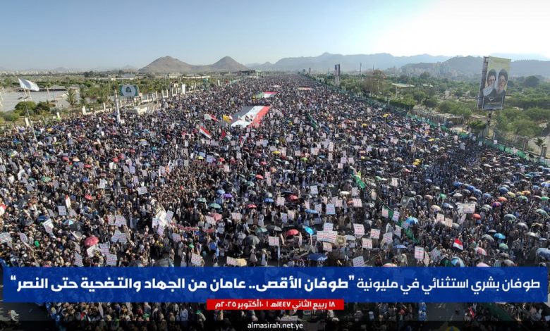 وأضاف “وما زلنا على العهد والوعد، نخرج اليوم خروجاً مليونياً في مسيرات استثنائية جهاداً في سبيل الله وابتغاء لمرضاته، مباركة للشعب الفلسطيني ومجاهديه الأعزاء، وتتويجاً لعامين من الاحتشاد الجهادي المشرف في مساندة الشعب الفلسطيني، وتأكيداً على ثباتنا على هذا الموقف الإيماني الراسخ حتى النصر المبين والفتح الموعود بإذن الله”.