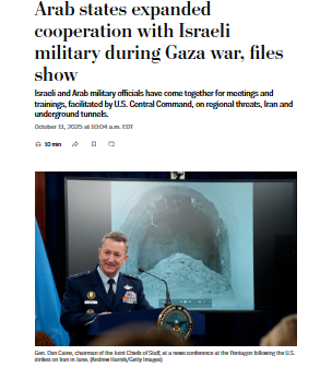 كشفت صحيفة واشنطن بوست أن ستة دول عربية (الأردن السعودية مصر البحرين الإمارات قطر) وسعت تعاونها العسكري مع الاحتلال خلال السنوات الثلاث الأخيرة نقلا عن مصادر مطلعة.