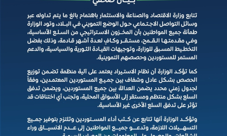 وقال البيان “تتابع وزارة الاقتصاد والصناعة والاستثمار ما يتم تداوله عبر وسائل التواصل الاجتماعي حول الوضع التمويني في البلاد”.