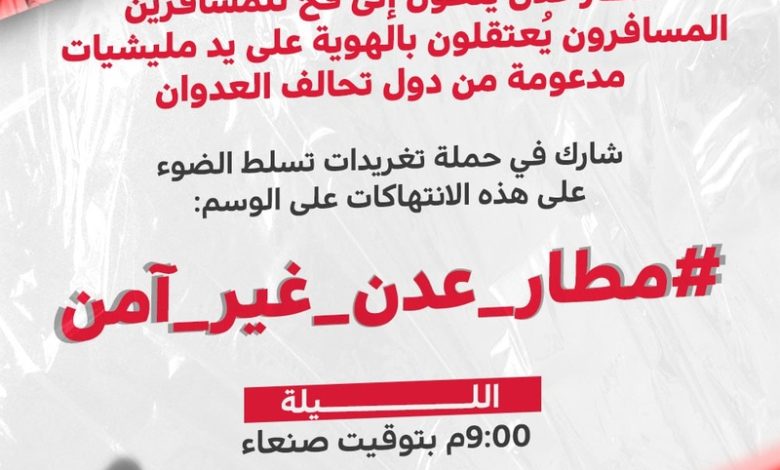 ودعا القائمون على الحملة، إلى التفاعل والمشاركة في الحملة التي تسلّط الضوء على الجرائم المتوالية والانتهاكات التي ترتكبها مليشيات تحالف العدوان بحق المسافرين عبر مطار عدن الدولي الذي تحول إلى فخ للمسافرين ممن يُعتقلون بالهوية على يد مليشيات مدعومة من دول تحالف العدوان وذلك على الوسم: