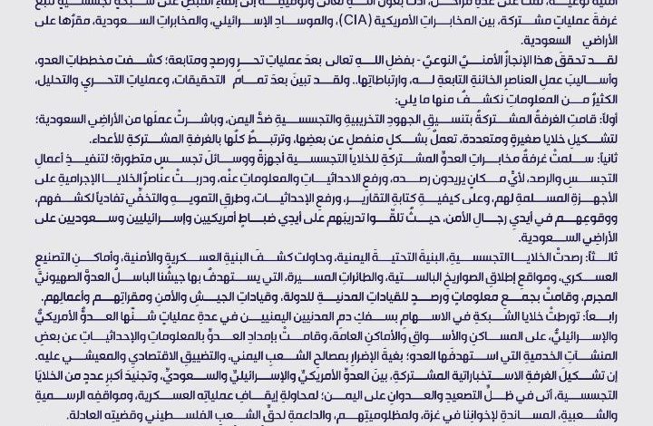إن تشكيلَ الغرفةِ الاستخباراتية المشتركةِ، بينَ العدوِّ الأمريكيِّ والإسرائيليِّ والسعوديِّ، وتجنيدَ أكبرِ عددٍ من الخلايَا التجسسية، أتى في ظلِّ التصعيدِ والعدوانِ على اليمن؛ لمحاولةِ إيقافِ عملياتِه العسكرية، ومواقفِه الرسميةِ والشعبيةِ، المساندةِ لإخوانِنا في غزة، ولمظلوميتِهم، والداعمةِ لحقِّ الشعبِ الفلسطيني وقضيتِه العادلة.