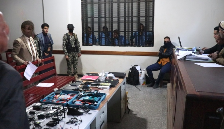 وفي الجلسة الأولى برئاسة رئيس المحكمة القاضي يحيى المنصور، وحضور رئيس النيابة القاضي عبدالله زهرة، ووكيل النيابة القاضي صارم الدين مفضل، وعضوي النيابة القاضي خالد عمر، والقاضي صلاح الشهاري، والثانية برئاسة القاضي ربيع الزبير وبحضور عضو النيابة القاضي نصر القاسمي، تم مواجهة المتهمين بأدلة الإثبات والتي شملت مجموعة مختلفة من المعدات الإلكترونية الحديثة والحساسة من أجهزة اتصال واستقبال وسحب شبكات وأسلحة وكاميرات تجسسية.
