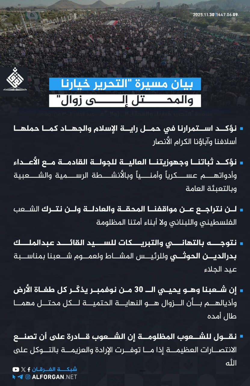 بيان مسيرة “التحرير خيارنا، والمحتل إلى زوال”: نؤكد استمرارنا في حمل راية الإسلام والجهاد كما حملها أسلافنا وآباؤنا الكرام الأنصار