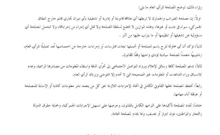 بيان توضيحي صادر عن مصلحة الضرائب والجمارك