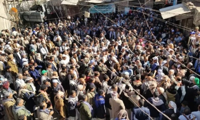 وتقاطرت الحشود الغفيرة التي تقدمها جموع من القيادات والمشايخ والوجهاء والشخصيات الاجتماعية والعقال ومختلف شرائح المجتمع، من كافة مراكز المديريات العشر مروراً بعدد من الشوارع والمداخل وباب اليمن والوصول إلى ساحة سوق الحلقة وميدان الجامع الكبير وجامع الإمام علي عليه السلام.