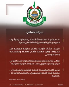 وأوضحت أن استهداف مقر تابع للأمم المتحدة يمثل سابقة خطيرة تؤكد أن العدو الصهيوني لا يعترف بأي شرعية دولية، ولا يقيم وزناً للقانون الدولي الإنساني، بل يتعامل مع المؤسسات الأممية كأهداف مباشرة في إطار مشروعه الاستعماري الإحلالي.