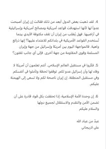 وبعث لاريجاني رسالة إلى جيران إيران، داعياً إيّاهم الى التفكير في مستقبل العالم الإسلامي، مضيفاً: “أنتم تعلمون أن أمريكا لا وفاء لها وأن “إسرائيل” عدو لكم، توقفوا لحظة وتأملوا في أنفسكم وفي مستقبل المنطقة، إن إيران ناصحة لكم ولا تسعى إلى الهيمنة عليكم”.