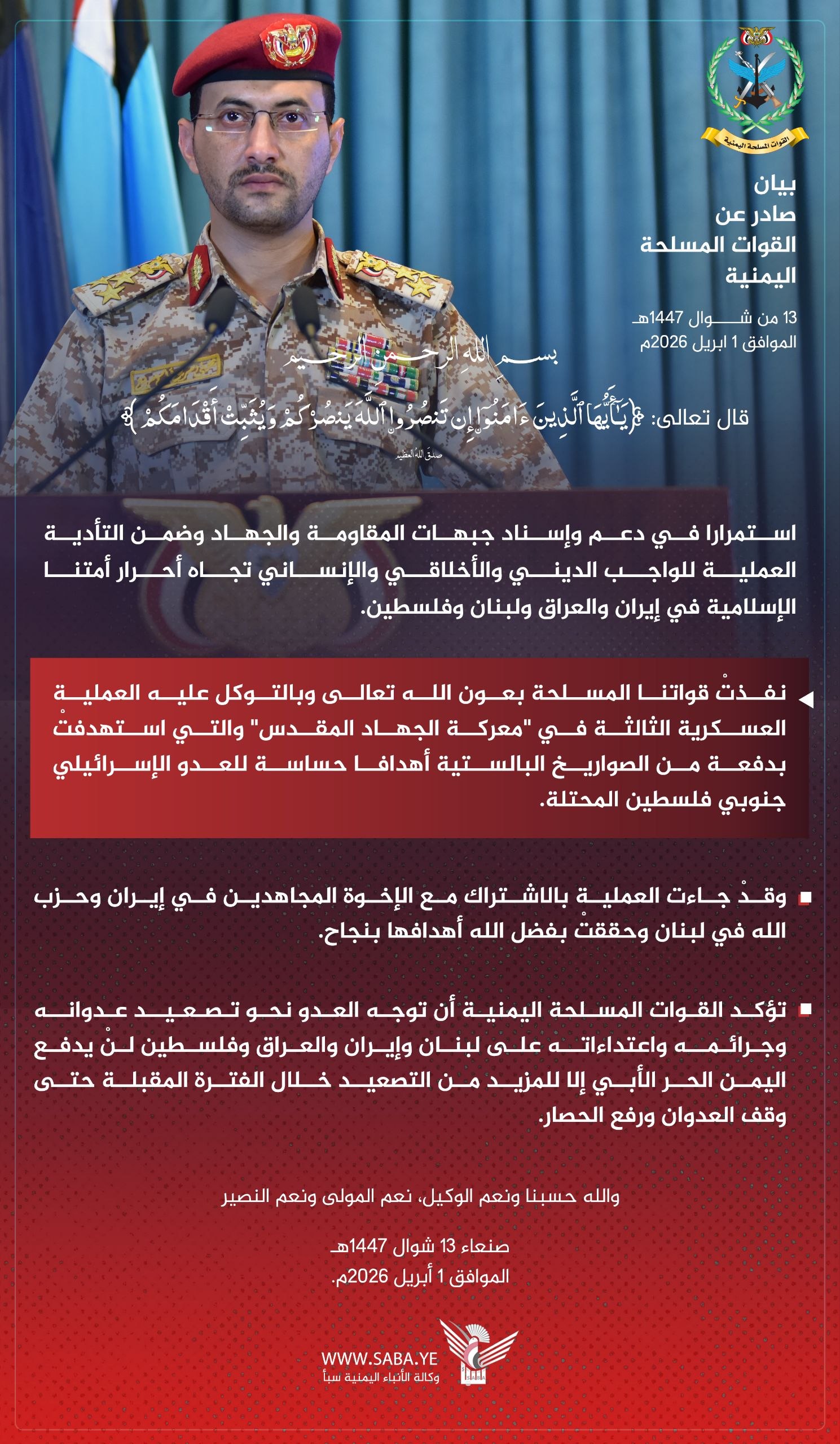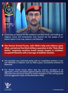 نَفَّذَتْ قواتُنَا المسلحةُ بعونِ اللهِ تعالى وبالتوكلِ عليهِ العمليةَ العسكريةَ الثالثةَ في “معركةِ الجهادِ المقدسِ” والتي استهدفتْ بدفعةٍ منَ الصواريخِ البالستيةِ أهدافاً حساسةً للعدوِّ الإسرائيليِّ جنوبيَّ فلسطينَ المحتلةِ.