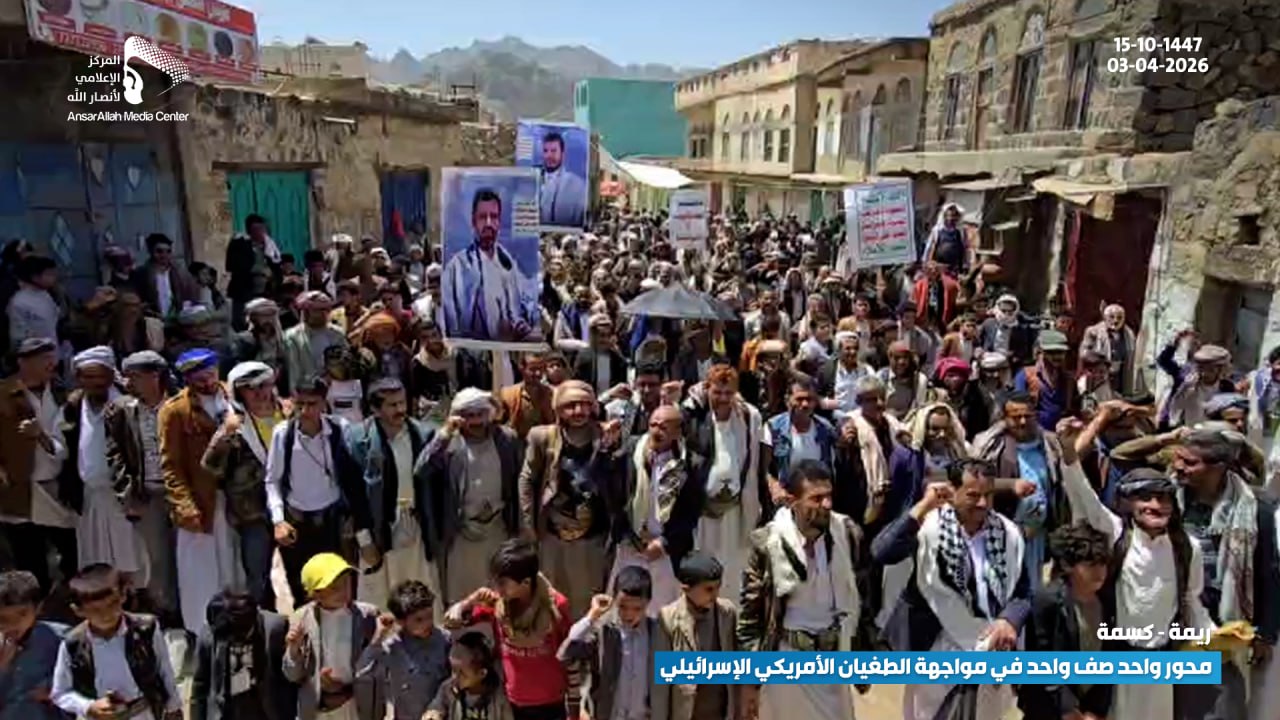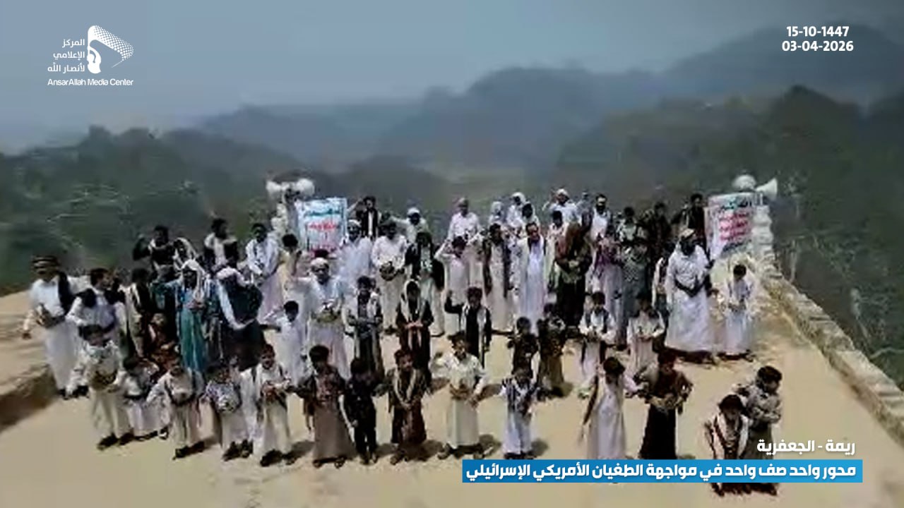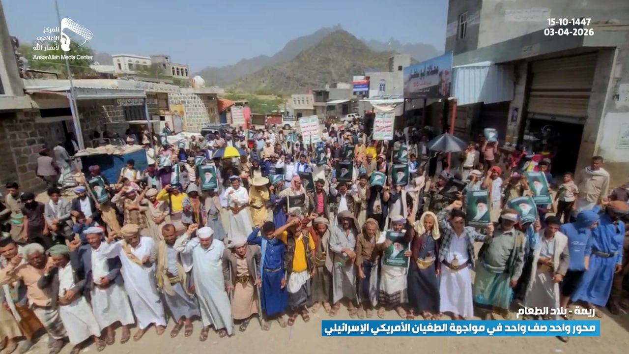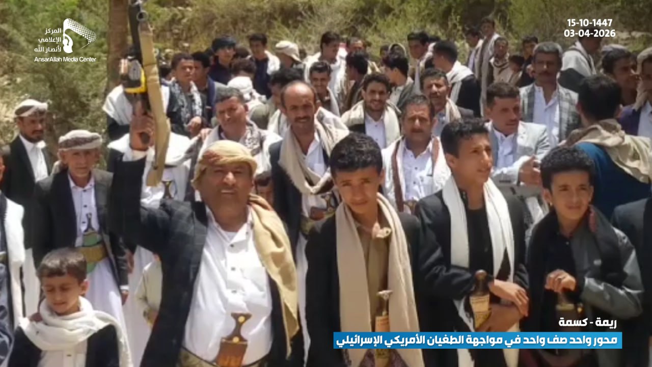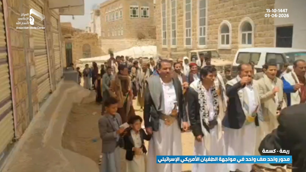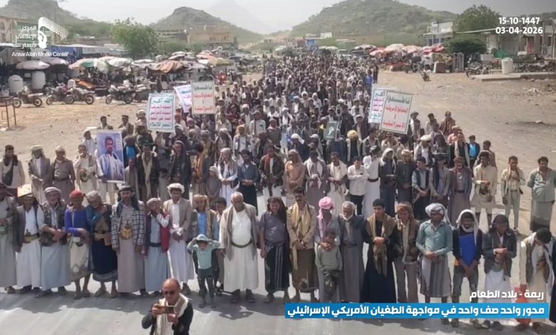 وأكد بيان صادر عن مسيرات ريمة، الوقوف صفا واحدا كالبنيان المرصوص مع محور الجهاد والمقاومة، في مواجهة محور الكفر والمخطط الصهيوني اليهودي المسمى بـ “إسرائيل الكبرى” الذي يستهدف كل الأمة بدون استثناء.