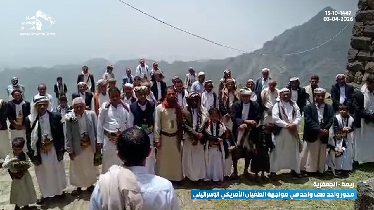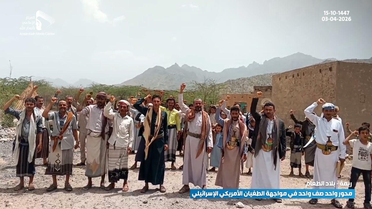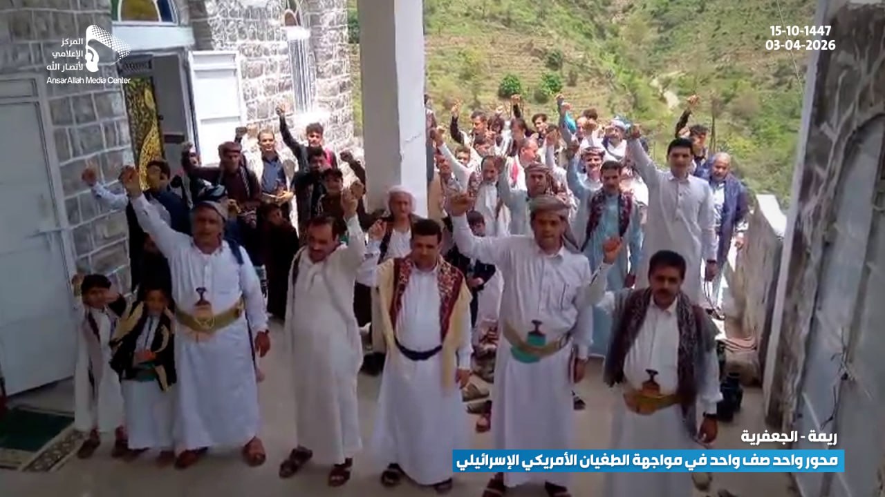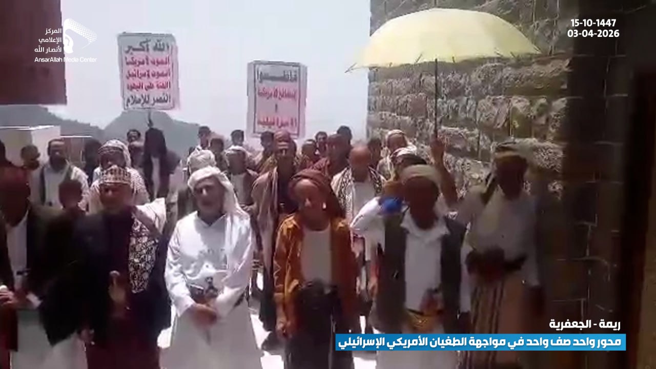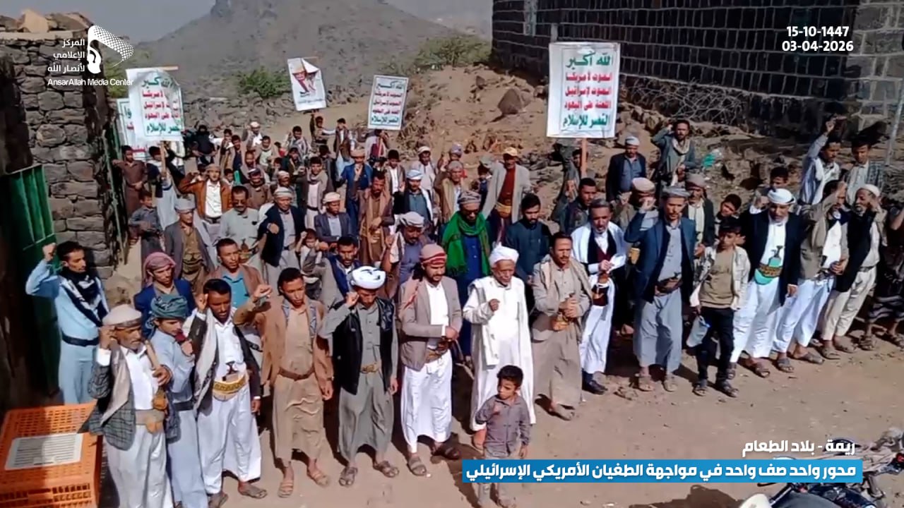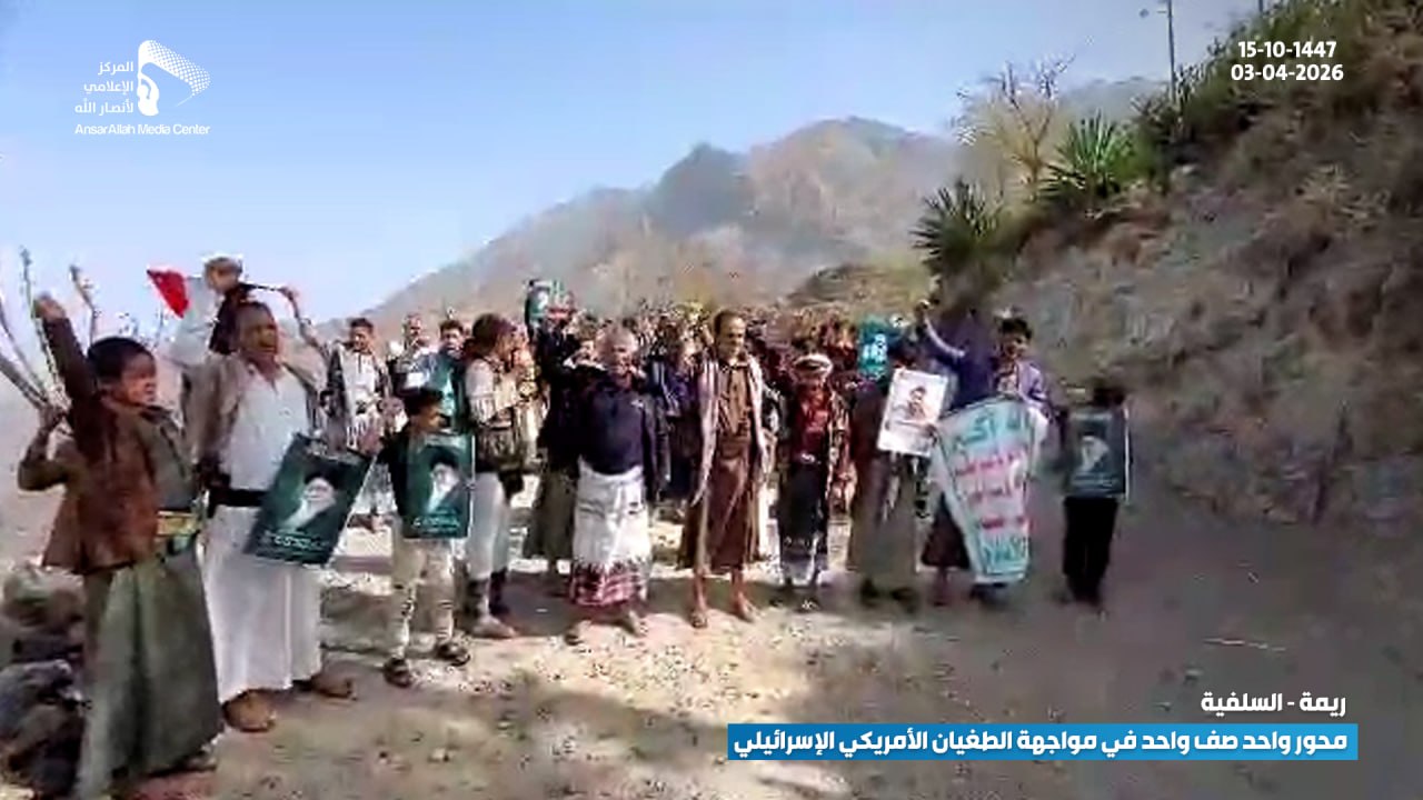 وأكد بيان صادر عن مسيرات ريمة، الوقوف صفا واحدا كالبنيان المرصوص مع محور الجهاد والمقاومة، في مواجهة محور الكفر والمخطط الصهيوني اليهودي المسمى بـ “إسرائيل الكبرى” الذي يستهدف كل الأمة بدون استثناء.