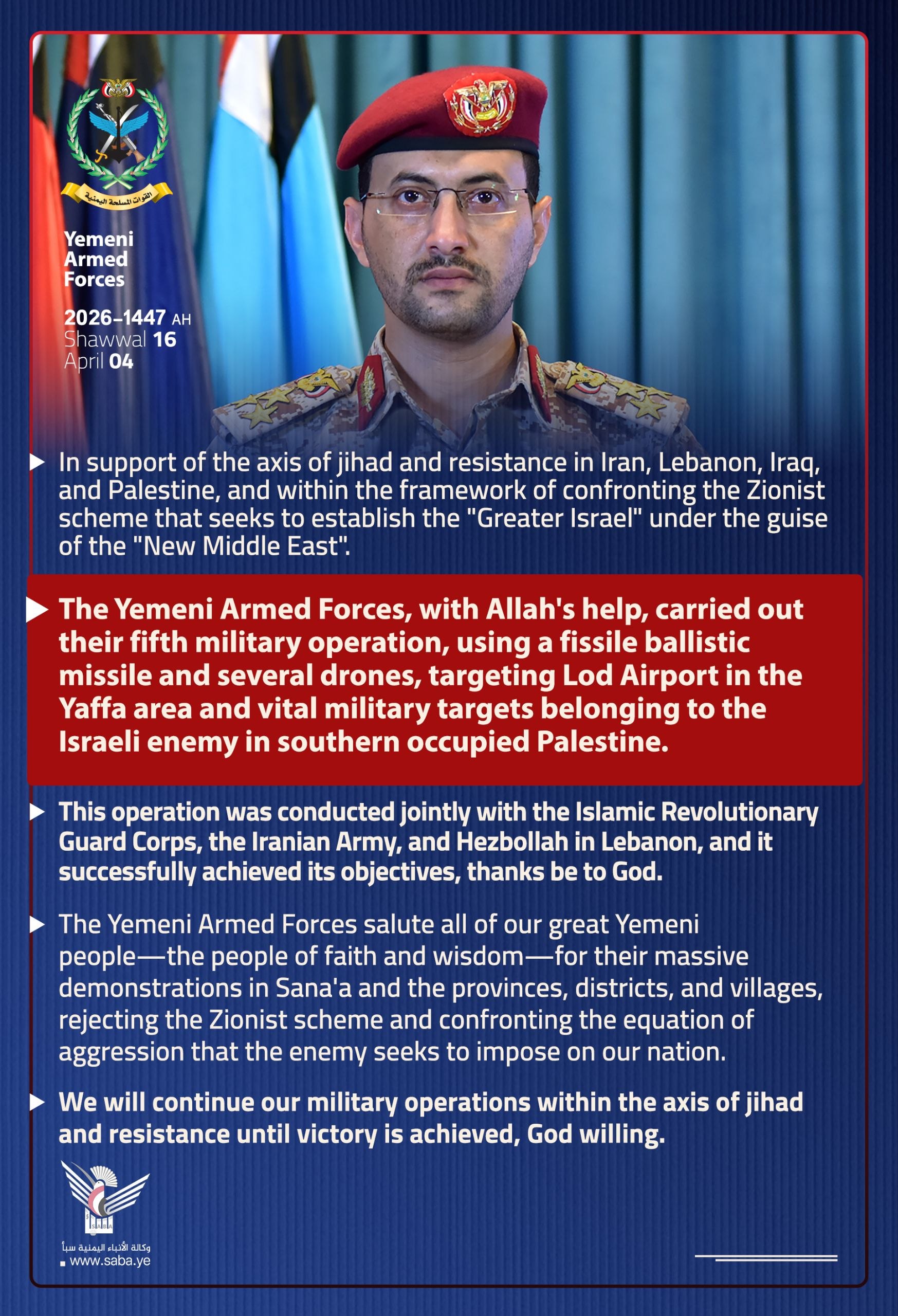 نفذتْ قواتُنا المسلحةُ بعونِ اللهِ تعالى العمليةَ العسكريةَ الخامسةَ، وذلك بصاروخٍ باليستيٍّ انشطاريٍّ وعددٍ من الطائراتِ المسيرةِ استهدفتْ مطارَ اللِّدِ في منطقةِ يافا وأهدافًا حيويةً وعسكريةً للعدوِّ الإسرائيليِّ جنوبي فلسطينَ المحتلةِ.