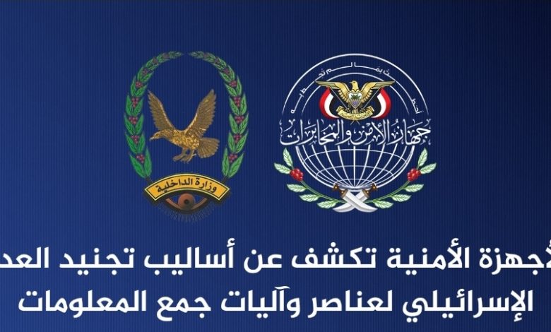 في إطار ما يمنّ الله به على شعبنا اليمني وعلى أجهزته الأمنية، من كشف وإحباط مخططات وأجندة العدو الإسرائيلي، والتي منها ما أعلن عنه مؤخراً بإلقاء القبض على عدد من العناصر التي عملت بصورة مباشرة مع مخابرات العدو الإسرائيلي، فقد أصبح جلياً لدى الأجهزة الأمنية أن العدو الإسرائيلي قام بعمل محاولات عديدة لتجنيد عدد من أبناء شعبنا وجمع المعلومات بهدف الإضرار باليمن ودوره المحوري في المنطقة.
