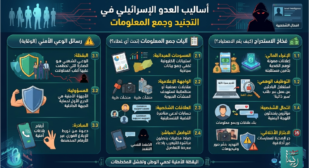 وإسهاماً من الأجهزة الأمنية في رفع وعي المواطنين.. فإننا نكشف عن عدد من أساليب تجنيد العدو الإسرائيلي للعناصر وآليات جمع المعلومات.