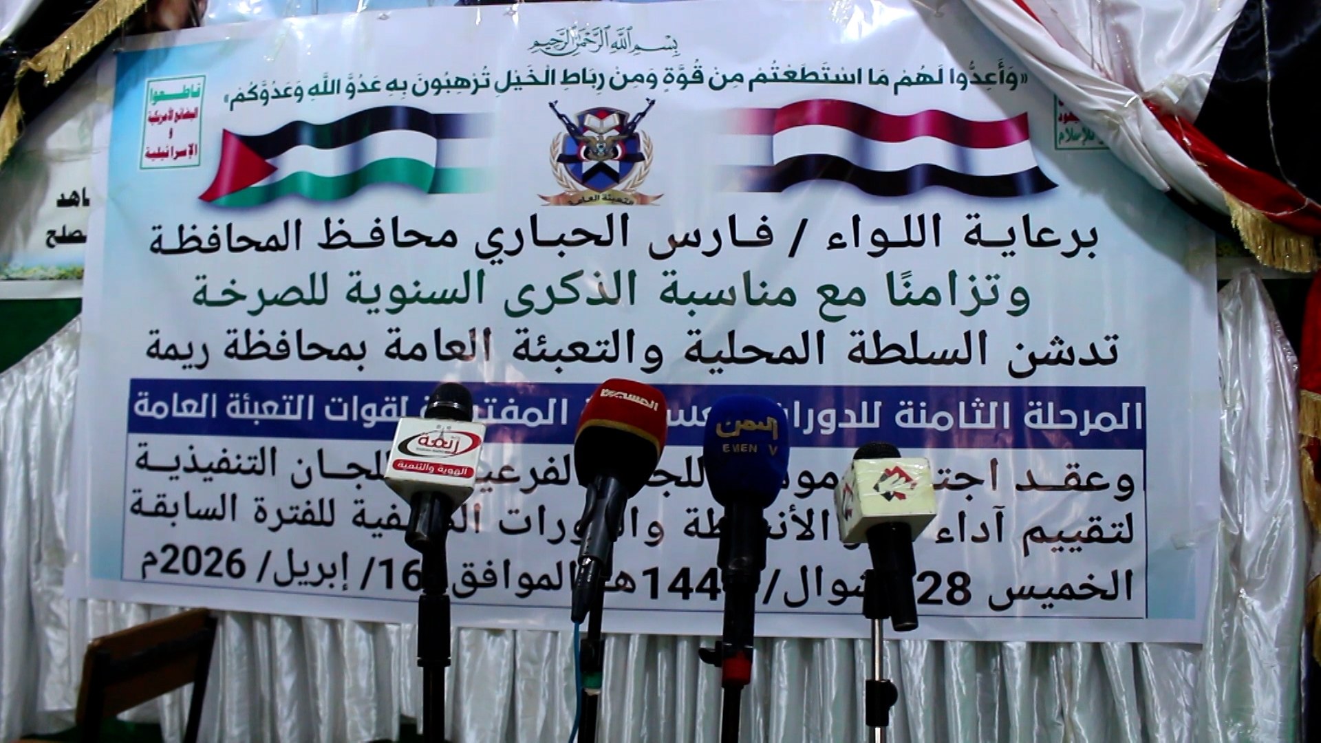 دشنت السلطة المحلية والتعبئة العامة بمحافظة ريمة، اليوم، المرحلة الثامنة من دورات “طوفان الأقصى” المفتوحة، تزامناً مع إحياء ذكرى الشعار (الصرخة في وجه المستكبرين)
