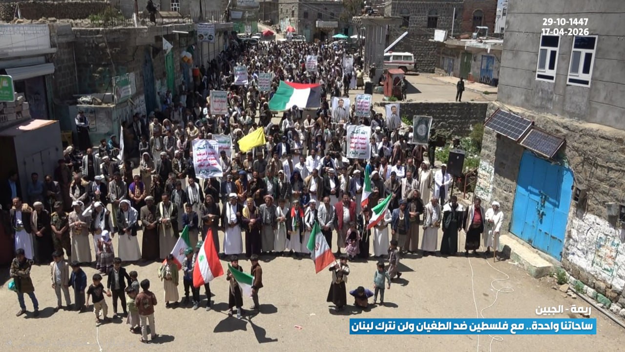 شهدت محافظة ريمة اليوم، 93 مسيرة جماهيرية تأكيدًا على ثبات الموقف مع لبنان وحزب الله وغزة والجهوزية لكل الخيارات تحت شعار “ساحاتنا واحدة.. مع فلسطين ضد الطغيان ولن نترك لبنان”.