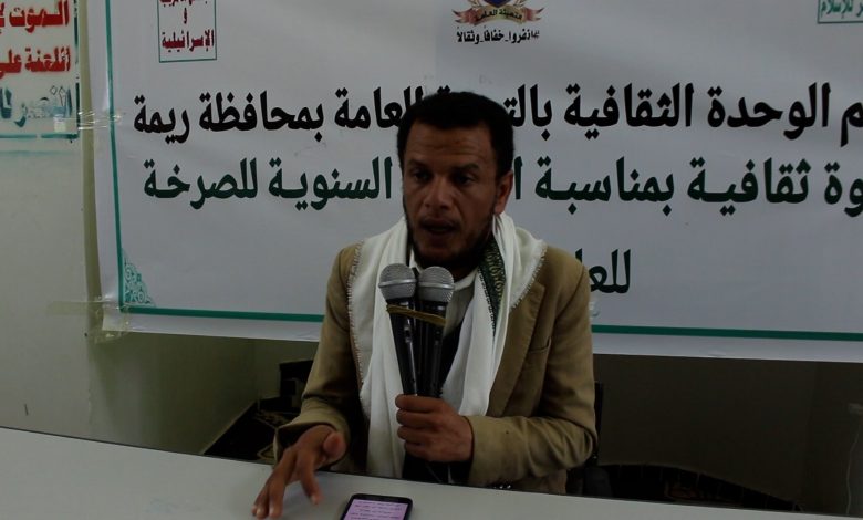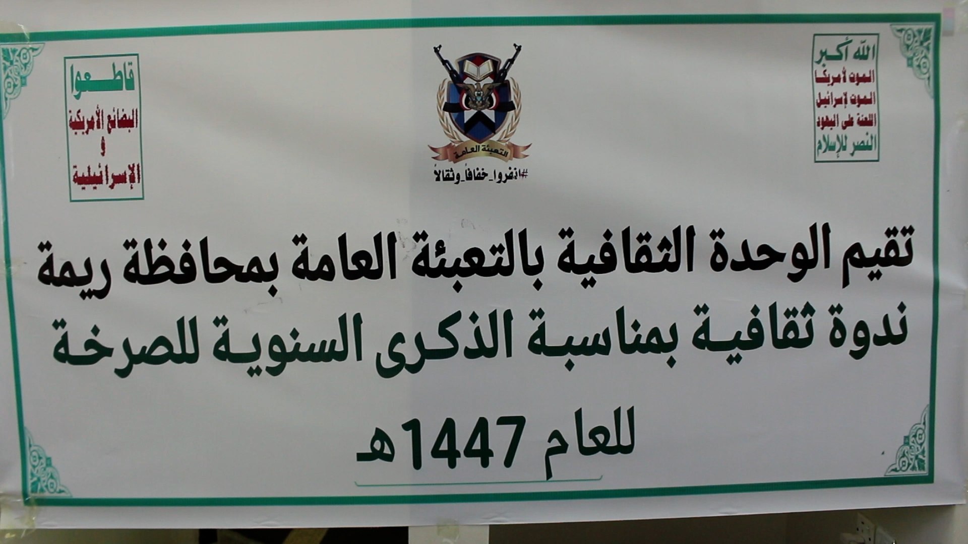 أحيت الوحدة الثقافية بالتعبئة العامة بمحافظة ريمة ندوة ثقافية بمناسبة الذكرى السنوية للصرخة للعام 1447 هجرية وخلال الندوة بحضور وكيل المحافظة محمد مراد استعرض مسؤول الوحدة الثقافية عبده الدرسي في المحور الأول المرتكزات الأساسية ومنطلقات الصرخة التي أطلقها الشهيد القائد السيد حسين بدر الدين الحوثي كشعار وموقف عملي شجاع يهدف إلى مناهضة قوى الاستكبار العالمي،