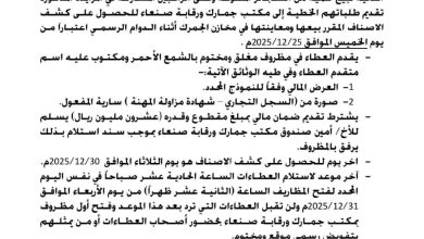 ريمة نت // يعلن مكتب جمارك ورقابة صنعاء عن إنزال المزايدة رقم (1) لسنة 2025م للمرة الثانية لبيع كمية من…